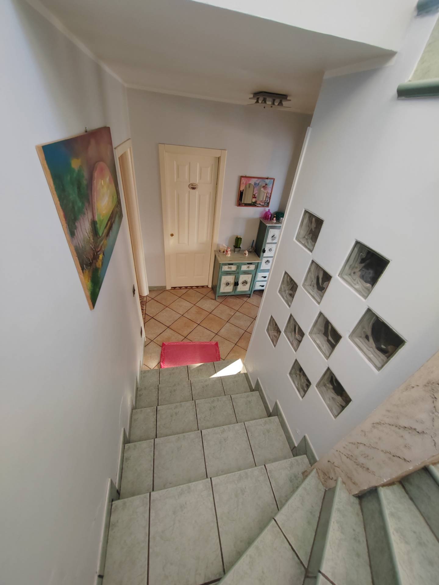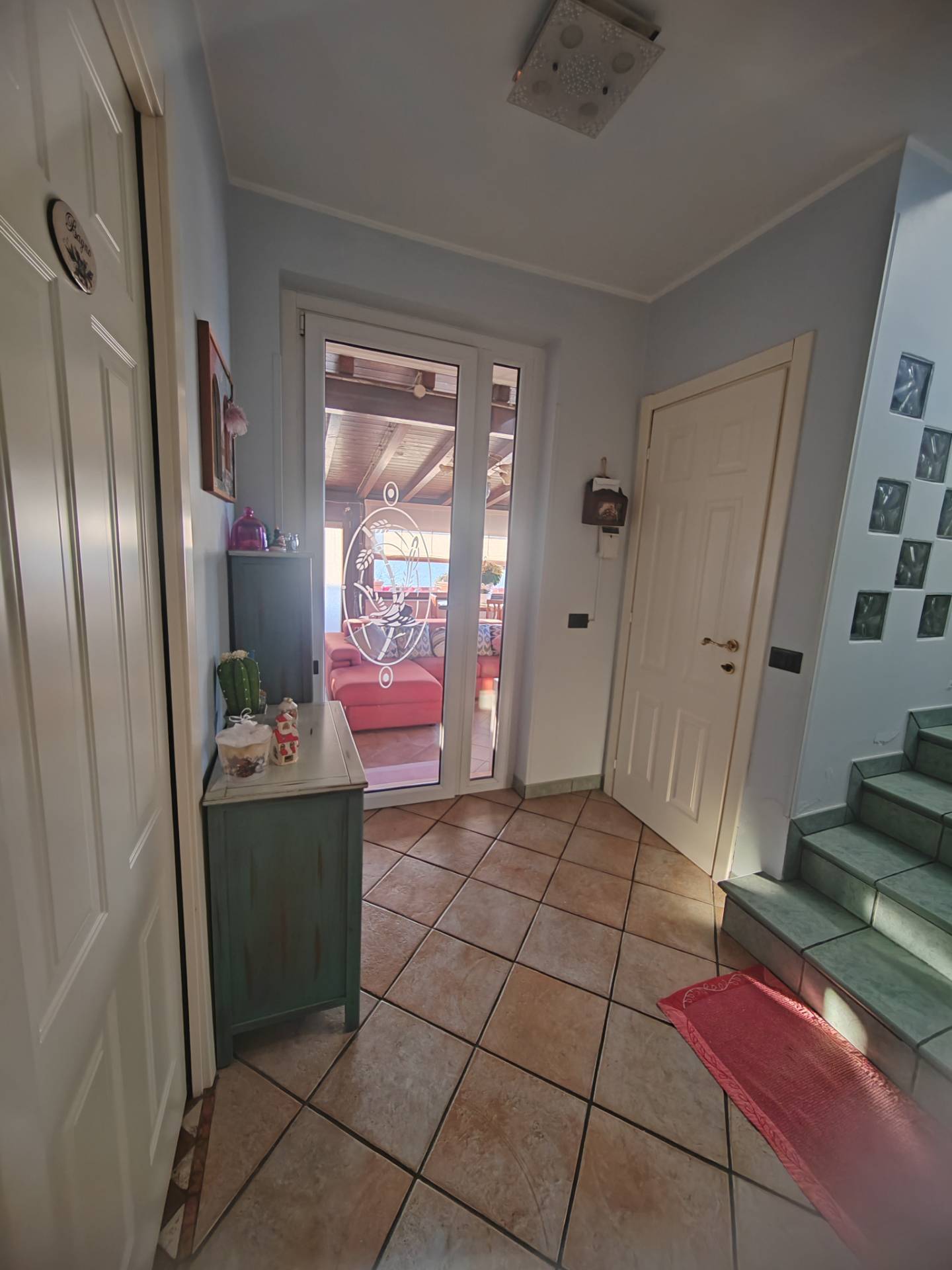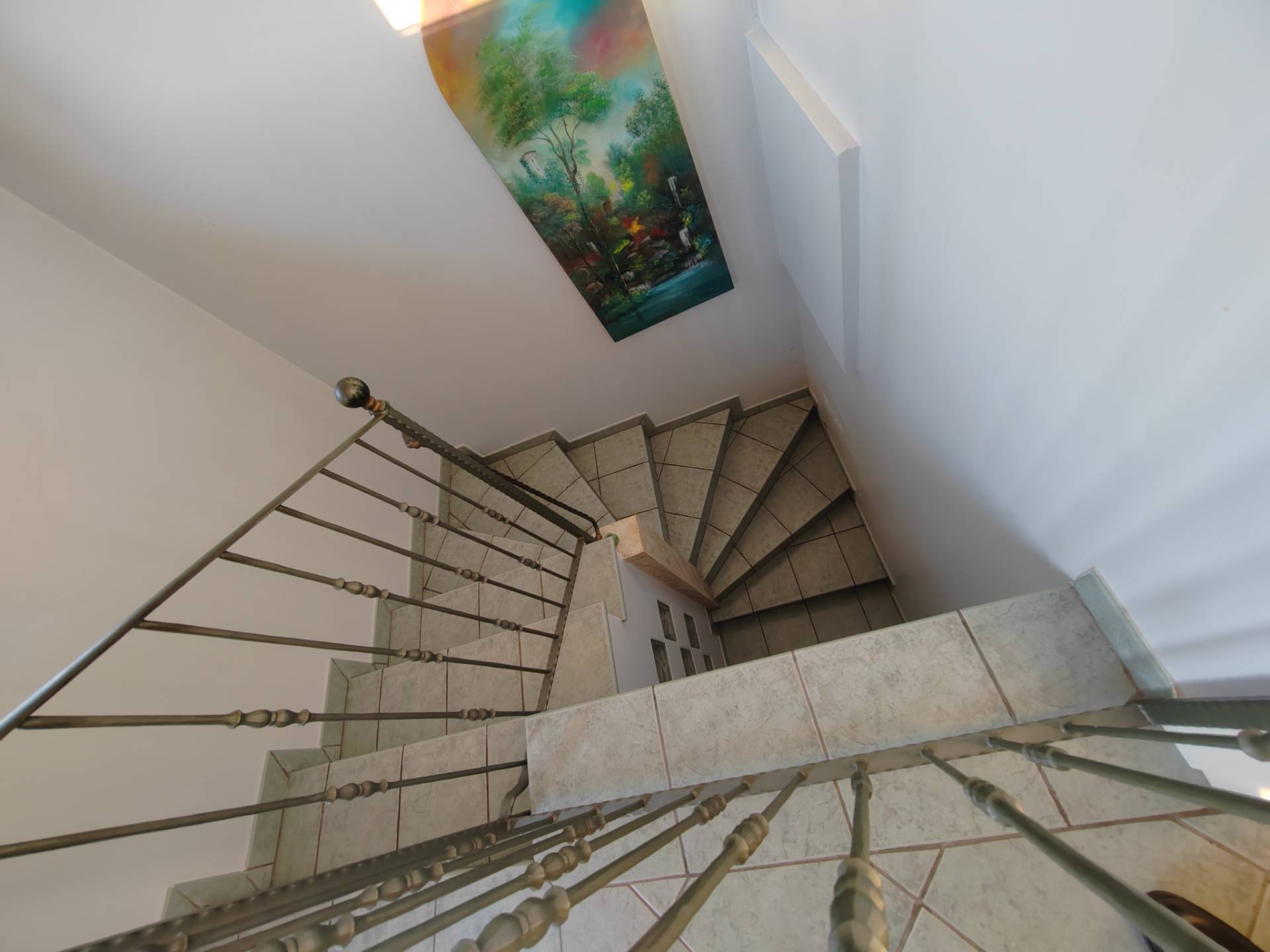 La zona giorno, situata al piano terra di circa 70 mq, si compone di un ingresso che apre su un ampio salone realizzato con grandi vetrate ed una cucina abitabile a vista e soggiorno con termocamino, lavatoio, bagno e un pratico ripostiglio nel sottoscala.